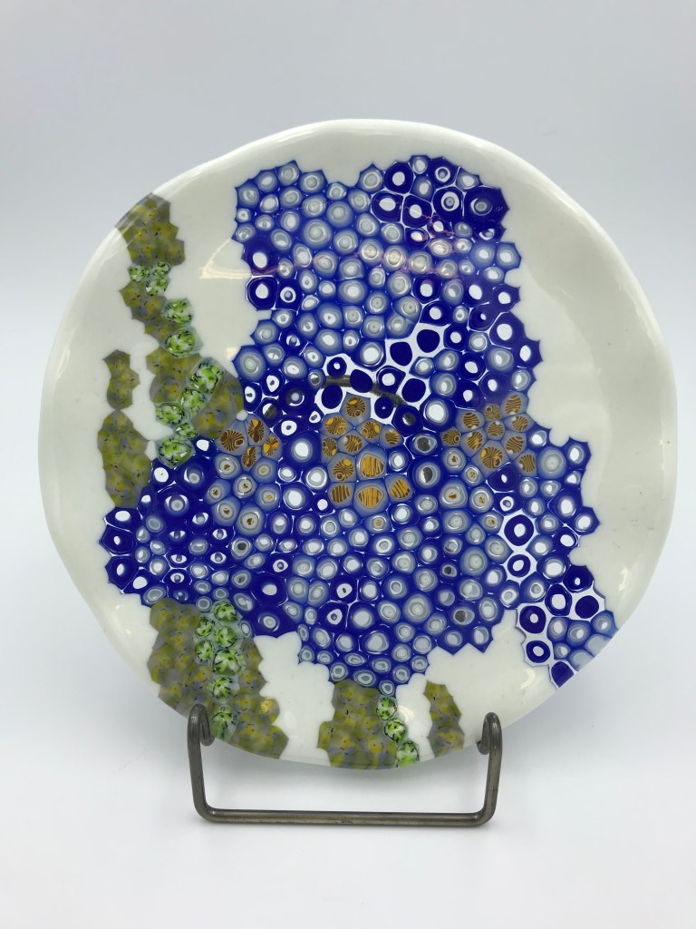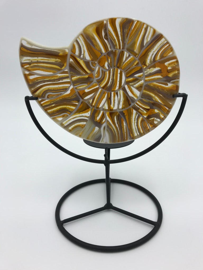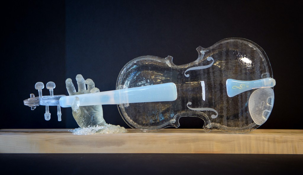 “Passions Unite” combines my love for for the violin and for glass. As a 20+ year violinist with the Meridian Symphony, I challenged myself to create a glass violin based on the luthier model from Cremona, Italy for the Stradivari 1617 Messiah violin. I cast the accessory pieces and my hand, which cradles the instrument, then created custom molds for the body and ribs.